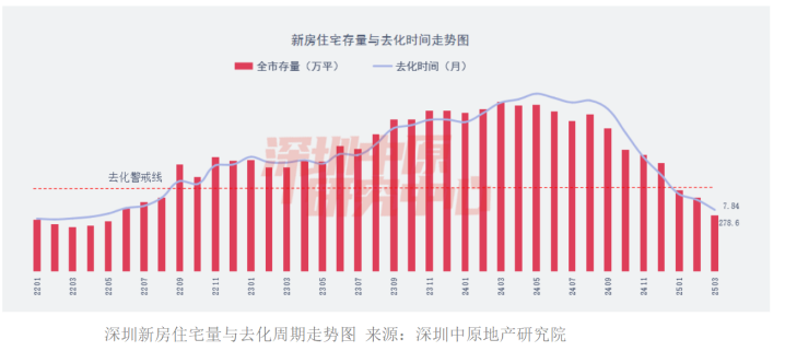 一方面土地供应节奏有所放缓,另一方面新房的去化相对稳定,使得深圳新房的库存快速去化。深圳中原研究院数据显示,截至今年3月末,深圳新房库存量为278.6万平方米,环比下降12.5%,这也是深圳新房库存时隔33个月后再度回落至300万平方米以下。